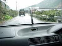 さて、道は狭い。小雨の降る中、トラックの跡についていざ馬路村へ! です |