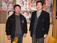 安田町で寄り道したのが「大心劇場」。館主の小松秀吉さん(左)。劇場横でお茶・軽食「豆でんきゅう」も経営されています。地元で活躍するシンガーソングライター「豆電球」としても有名。昨年、30周年記念コンサートが開かれました